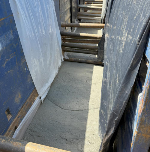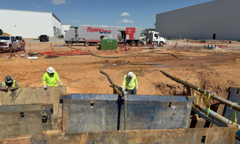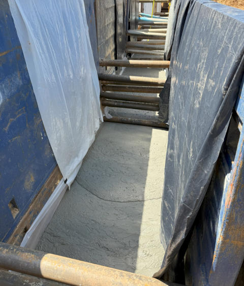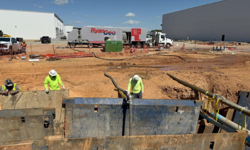 Location: Lexington, NC Overview: Project Gemini used Low-Density Cellular Concrete to address settlement issues along a sanitary sewer alignment caused by poor subsurface conditions. LDCC was selected as an engineered fill solution to stabilize the pipe and prevent future deflection where traditional remediation methods had proven unsuccessful. Challenge: A 120-linear-foot section of 6-inch SDR 26 sanitary sewer pipe exhibited sagging due to silty soils, partially weathered rock near the pipe invert, and groundwater levels at or above the invert elevation. These conditions reduced the shear strength of the supporting soils, creating a soft and compressible subgrade. After two unsuccessful remediation attempts, the geotechnical engineer evaluated three corrective options: over-excavation, aggregate piers, or cellular concrete fill. Further evaluation suggested that vibratory loading from structural fill placed above the pipe may have contributed to the settlement, increasing the risk of continued deflection if traditional backfill methods were used again. Solution: Low-Density Cellular Concrete (LDCC) was selected due to its lightweight properties, uniform load distribution, and elimination of compaction- induced vibration. RyanGeo placed LDCC above the pipe for the first 7 feet of backfill, reducing mechanical influence on the pipe while providing consistent support. A total of 250 cubic yards of 30 pcf LDCC was placed in two 3.5-foot lifts over two days, stabilizing the alignment and preserving pipe geometry. Results: Pipe Length Stabilized: 120 linear feet of 6" SDR 26 sanitary sewer Material Placed: 250 cubic yards of 30 pcf LDCC Placement Configuration: Two 3.5-foot lifts over two days Key Benefit: Reduced settlement risk and eliminated vibration-induced pipe deflection