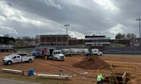 Location: Newton-Conover, NC Overview: This project involved the abandonment of a deteriorated stormwater system located beneath the football field at Newton-Conover High School. The work was completed with minimal surface disruption, allowing the facility to remain intact while addressing critical underground infrastructure issues. Challenge: The existing 54-inch stormwater pipe extended beneath the high school football field, making traditional removal disruptive, time-consuming, and costly. Once onsite, additional failing pipe was identified, requiring the scope to expand rapidly without impacting schedule or site operations. Solution: Low-Density Cellular Concrete (LDCC) was selected to abandon the stormwater system due to its flowability and ability to be placed without excavation. RyanGeo initially abandoned 475 linear feet of 54-inch diameter pipe. Leveraging RyanGeo’s ability to rapidly adapt to changing site conditions, an additional 275 linear feet of 54-inch pipe was incorporated into the scope with only one day’s notice. In a single day, 440 cubic yards of 30 pcf LDCC was placed, fully filling the stormwater system and eliminating the need for pipe removal beneath the field. Results: Total Pipe Abandoned: 750 linear feet of 54- inch stormwater pipe Total Volume Placed: 440 cubic yards of 30 pcf LDCC Production Rate: Completed in one day Schedule Savings: Eliminated more than three weeks of work compared to traditional pipe removal methods